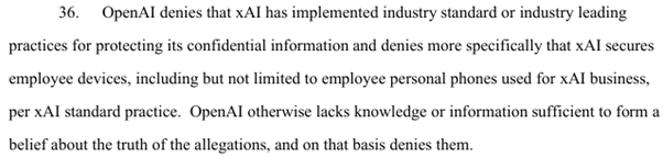 3. Para 36 of OpenAI’s answer is interesting. It seems a like a specific denial. Unless OpenAI has access to the standards that are applied by xAI in its works, it is unfathomable as to how it can claim to know whether xAI secures employee devices or does not adopt proper standards for protecting confidential information. OpenAI must be queried on this.